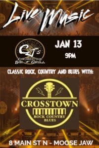 Join Us on January 13 2024 For the best in rock country and the blues with The Cross Town Band we look forward to seeing you there at the cornerstone. The best and newest place for live entertainment in Moose Jaw.
